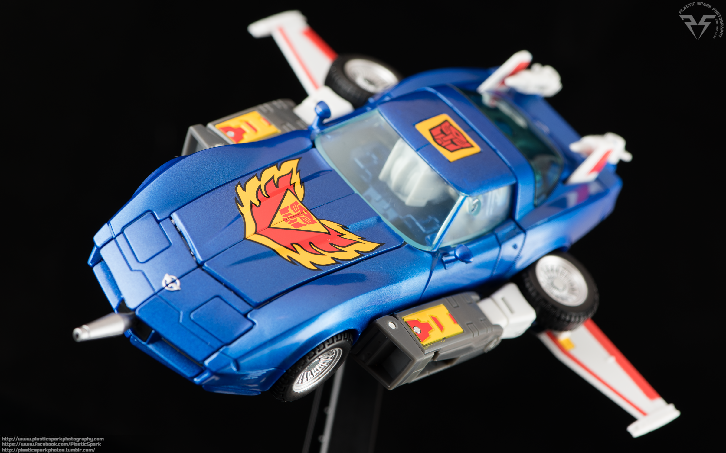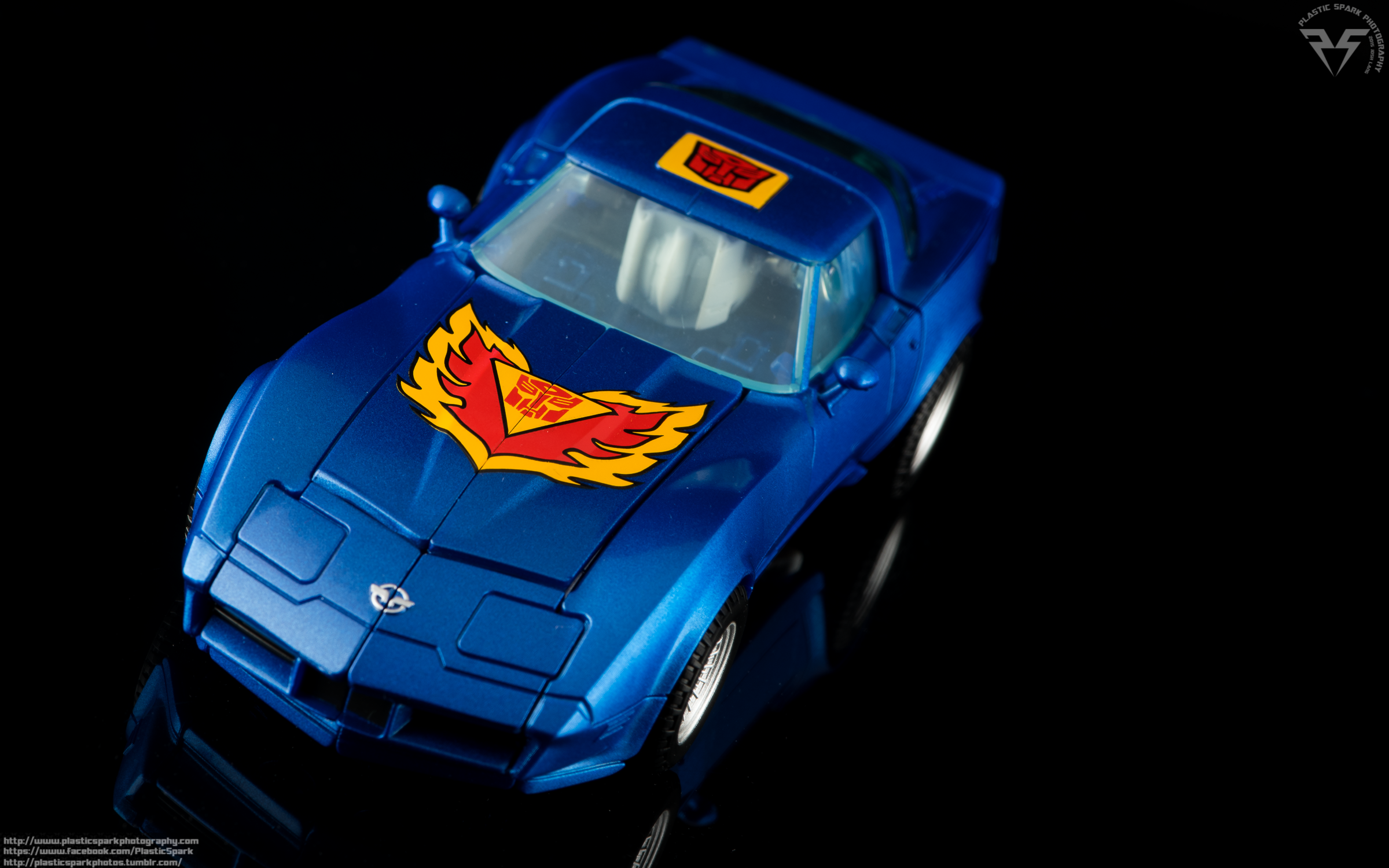 Tracks’ vehicle mode is nothing short of gorgeous. Combining a beautiful metallic blue paint with the sleek smooth lines of one of the most beautiful cars in existence, the Corvette Stingray, makes this Autobot a real showstopper when it comes to vehicle mode. Much like Wheeljack and other MP cars his wing mirrors come separate on a small sprue, you get 2 sets and they peg in to small holes in the sides of the doors. One of my sets had some of the blue paint rubbed off the rear of the mirror, but the other set was without issue. A nice touch is that they painted the front of the mirror silver as well. Tracks’ wheels are painted in a brilliant silver with highly detailed rims and nicely sculpted tire treads. The tires are plastic which I know is a bit of a letdown for some people but personally I’m ok with it. They don’t pick up dust the way rubber tires do and I don’t have to worry about the possibility of them cracking or degrading over time.